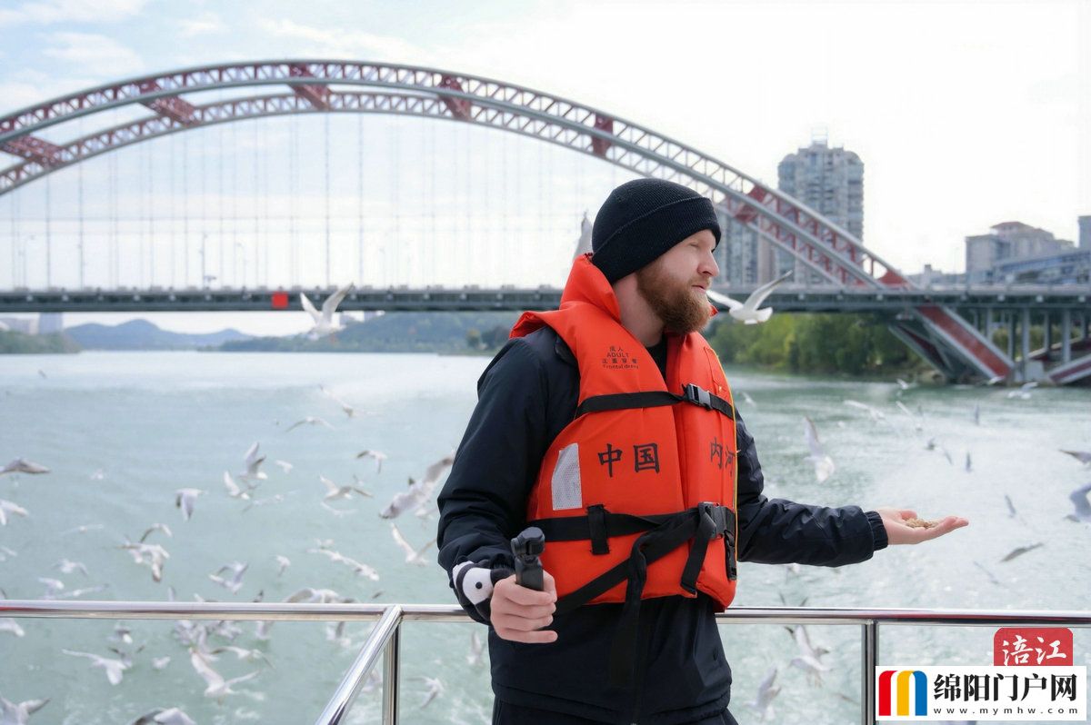 行程尾聲,外賓游覽三江碼頭,欣賞涪江、安昌江與芙蓉溪交匯處的生態景觀。初冬時節,西伯利亞紅嘴鷗成群翩躚,展現綿陽人與自然和諧共生的城市畫卷。